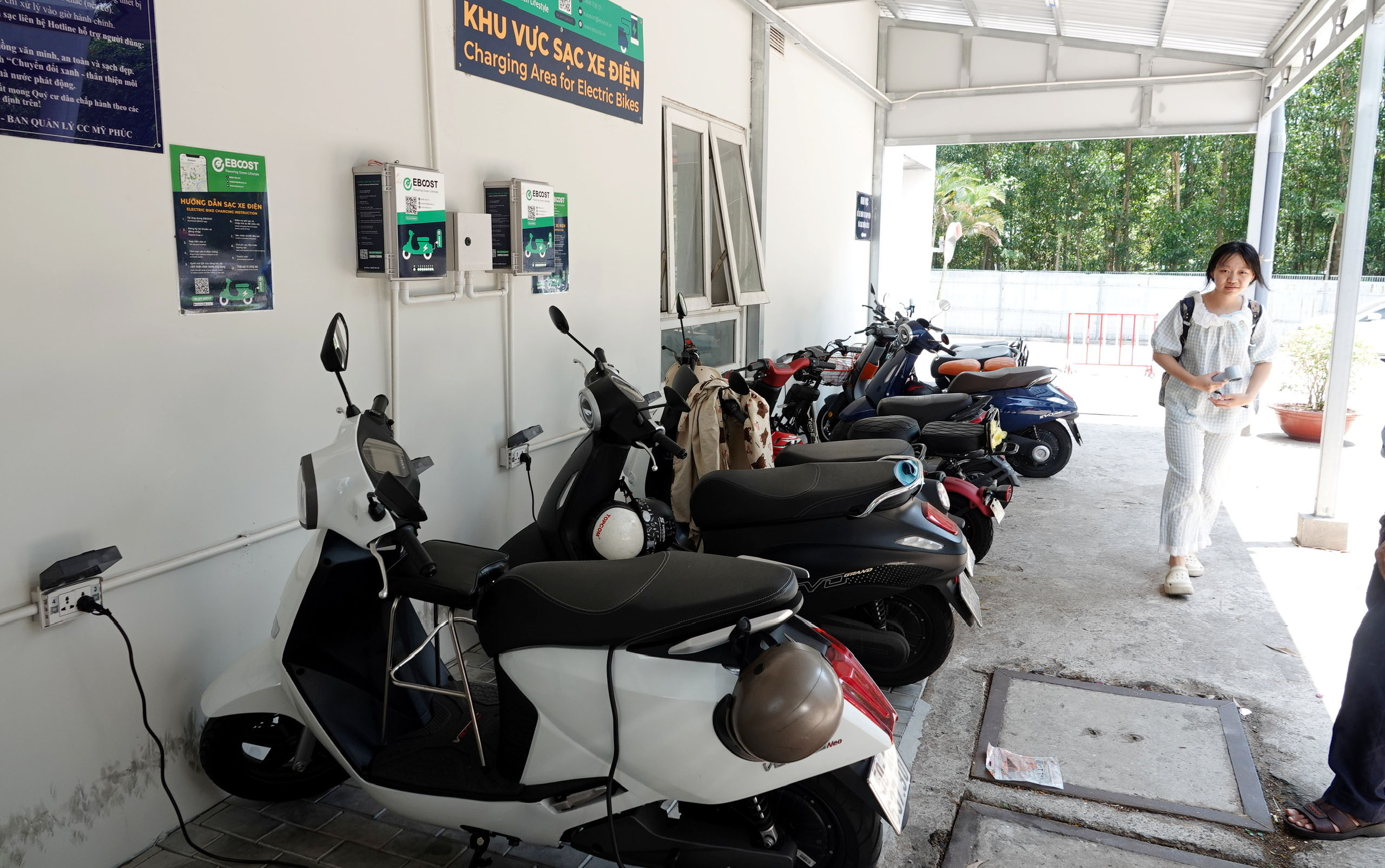 Đây là một trong số ít mô hình thực tế cho thấy việc lắp đặt trạm sạc trong chung cư là khả thi. Thay vì đặt dưới tầng hầm, nơi dễ quá tải và hạn chế lưu thông, trạm sạc được bố trí ở khu vực ngoài trời. Đáng chú ý, vị trí này trước đây là bãi đất trống phía sau, từng dùng để tập kết rác. Việc cải tạo này không chỉ giải quyết nhu cầu sạc mà còn cải thiện môi trường sống.
